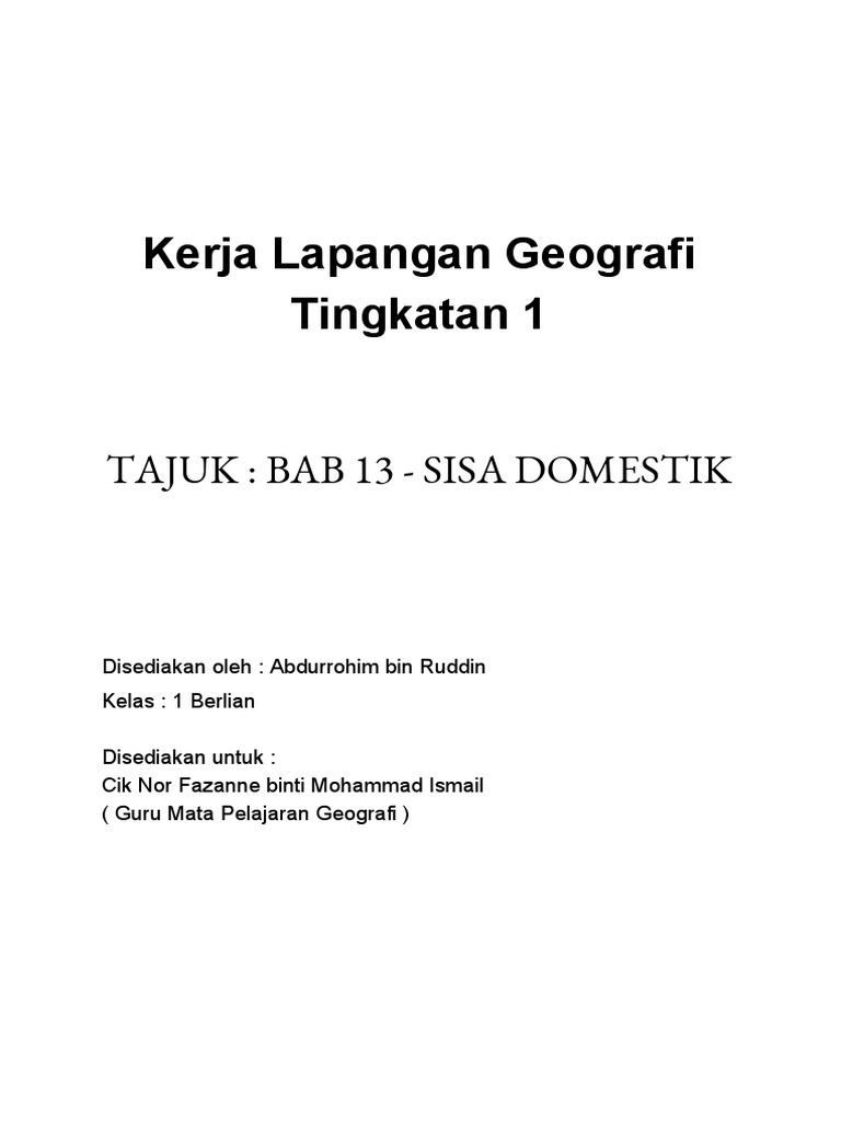 Hasil kajian konsep kajian merujuk buku teks tingkatan 1 konsep sisa domestik ialah sisa sisa yang terkumpul dan tidak menyelenggarakan. Contoh kerja kursus geografi 2011 1. 1 ikmal nama guru.